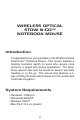 WIRELESS OPTICAL STOW-N-GOTM NOTEBOOK MOUSE Introduction Congratulations on your purchase of the Wireless Optical Stow-N-GoTM Notebook Mouse. This mouse features a tracking resolution switch for users who require more precision or speed with various applications. The StowN-Go receiver clips onto the mouse for ease of use while traveling or on the go. This mouse also features a 4way scrolling tilt-wheel which allows for both vertical and horizontal navigation.