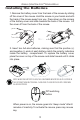 Wireless Optical Stow-N-GoTM Notebook Mouse Installing the Batteries 1. Remove the battery cover from the back of the mouse by sliding off the cover of the mouse. Hold the mouse in your hands and with the back of the mouse away from you. Press down on the corners of the battery cover and slide towards the back of the mouse. Lift the cover off from the back of the mouse. 2.