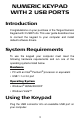 NUMERIC KEYPAD WITH 2 USB PORTS Introduction Congratulations on your purchase of the Targus Numeric Keypad with 2 USB Ports. This user guide describes how to connect the keypad to your computer and install default software drivers. System Requirements To use the keypad your computer must meet the following hardware requirements and run one of the operating systems listed below. Hardware • PC with an Intel® Pentium® processor or equivalent • USB 1.1 or 2.