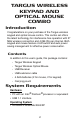 TARGUS WIRELESS KEYPAD AND OPTICAL MOUSE COMBO Introduction Congratulations on your purchase of the Targus wireless keypad and opitcal mouse combo. This combo set offers the latest technology for interference free operation with 27 MHz wireless connection and 4,096 IDs per channel. Both keypad and mouse feature on/off switch and auto power saving management for effective power conservation.