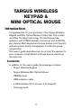 TARGUS WIRELESS KEYPAD & MINI OPTICAL MOUSE Introduction Congratulations on your purchase of the Targus Wireless Keypad and Mini Optical Mouse Combo Set. This combo set offers the latest technology for interference-free operation with 27MHz wireless connection and 4,096 IDs per channel. Both keypad and mouse feature on/off switch and auto power saving management for effective power conservation.