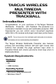 TARGUS WIRELESS MULTIMEDIA PRESENTER WITH TRACKBALL Introduction Congratulations on your purchase of the Targus Wireless Multimedia Presenter with Trackball. The presenter is a combination trackball mouse and multimedia presenter. With thepresenter you can control cursor movement anywhere within 20m of its receiver and project ared laser pointer beam. NOTE: THE ACTUAL EFFECTIVE DISTANCE MAY INCREASE OR DECREASE DEPENDING ON THE SURROUNDING ENVIRONMENT.