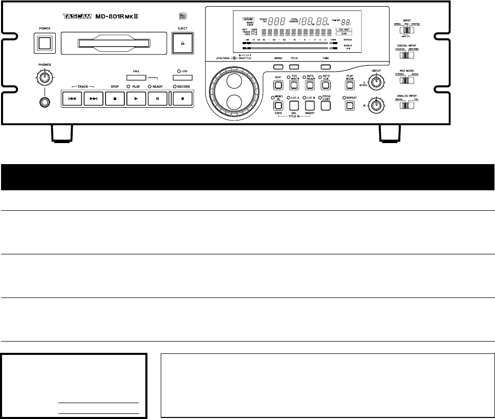 » MD-801R@#/ MD-801P@# TEAC CORPORATION Phone: (0422) 52-5082 3-7-3, Nakacho, Musashino-shi, Tokyo 180-8550, Japan TEAC AMERICA, INC. Phone: (213) 726-0303 7733 Telegraph Road, Montebello, California 90640 TEAC CANADA LTD. Phone: 905-890-8008 Facsimile: 905-890-9888 5939 Wallace Street, Mississauga, Ontario L4Z 1Z8, Canada TEAC MEXICO, S.A. De C.V Phone: 5-658-1943 Privada De Corina, No.