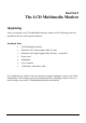 CHAPTER 1 The LCD Multimedia Monitor Unpacking After you unpack your LCD multimedia monitor, make sure the following items are included in the box and in good condition: Standard Item • LCD multimedia monitor • Monitor-to-PC analog signal cable (15-pin) • Monitor-to-PC digital signal cable (24-pin) – (Optional) • Power cord • Addendum • User’s manual • 1.5M Stereo Jack audio cable If you find that any of these items are missing or appear damaged, contact your dealer immediately.