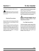 Section 1 To the Installer This machine is designed for indoor use only. In all other areas of the world, equipment should be installed in accordance with the existing local codes. Please contact your local authorities. DO NOT install the machine in an area where a water jet could be used to clean or rinse the machine. Failure to follow this instruction may result in serious electrical shock.