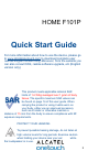 ! ! HOME F101P Quick Start Guide For more information about how to use the device, please go to www.alcatelonetouch.com to download complete user manual English version only).Moreover, from the website you can also consult FAQ, realize software upgrade, etc (English version only). ! ! This product meets applicable national SAR limits of 1.6 W/kg averaged over 1 gram of body tissue. The specific maximum SAR values can be found on page 16 of this user guide.