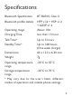 Specifications Bluetooth Specification BT BLE4.0, Class 2 Bluetooth profile details HFP v1.6 + HSP v1.2 + A2DP v1.2 Operating range About 10m Charging Time less than 1.5 hour Talk Time* Up to 5 hours Standby Time* Up to 168 hours (One week charge) Dimensions 60 x 12.3 x 6.30 mm Weight 7g Operating temperature range -20°C to 55°C Storage temperature range -30°C to 70°C * May vary due to the user’s habit, different modes of operation and mobile phone settings.