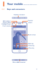 Camera Flash/Flashlight Camera Power key Volume key SIM card slot Menu key • Touch to view recently used applications. Home key • From any application or screen, touch to return to the Home screen. • Long press to pop up Google search icon. Slide your finger to the icon to open Google search. Back key • Touch to go back to the previous screen, or to close a dialog box, options menu, the notification panel, etc. These keys are visible when the phone is unlocked.