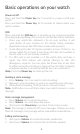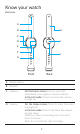 Know your watch Overview A B H C I D E F J G Front Back A Watch-button B Speaker C Volume + On the Home screen: Press to open the phonebook, press again to choose contacts. In the List mode: Press to increase the volume or page up. D Volume - On the Home screen: Press to enter the voice messages list. In the List mode: Press to decrease the volume or page down. When you have an incoming voice call, short press to answer. Press for 3 seconds to start recording.