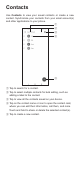 Contacts Use Contacts to view your saved contacts or create a new contact. Synchronize your contacts from your email account(s) and other applications to your phone. ① ② ③ ④ ⑤ ①T ap to search for a contact. ②T ap to select multiple contacts for bulk editing, such as adding a label to the contact. ③ Tap to view all the contacts saved on your device. ④T ap on the contact name or icon to open the contact card, where you can edit their information, call them, and more.