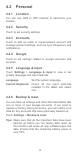 4.2 Personal 4.2.1 Location You can use GPS or WiFi network to determine your location. 4.2.2 Security Touch to set security settings. 4.2.3 Accounts Touch to add an email or social-network account and manage account settings, such as sync frenquency and notifications. 4.2.4 Google Touch to set settings related to Google accounts and services. 4.2.5 Language & input Touch Settings > Language & input to view or set system language and input methods. Language Set the system language.