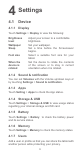 4 Settings 4.1 Device 4.1.1 Display Touch Settings > Display to view the following: Brightness level Wallpaper Sleep Font size When the device is rotated 4.1.2 Adjust your screen to a comfortable brightness. Set your wallpaper. Set a time before the Screensaver begins. Select a suitable font size for your tablet. Set the device to rotate the contents of the screen or to stay in current orientation when it is rotated.