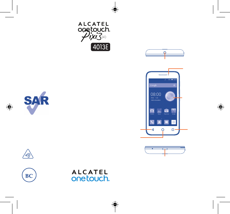 1 Your mobile ����������������� 1.1 Keys and connectors Headset connector Quick Start Guide Front Camera For more information about how to use the phone, please go to www.alcatelonetouch.com to download the complete user manual. From the website you can also consult the FAQ, upgrade software, etc. This product meets applicable national SAR limits of 1.6 W/kg. The specific maximum SAR values can be found in the RADIOWAVES section of this user guide. www.sar-tick.
