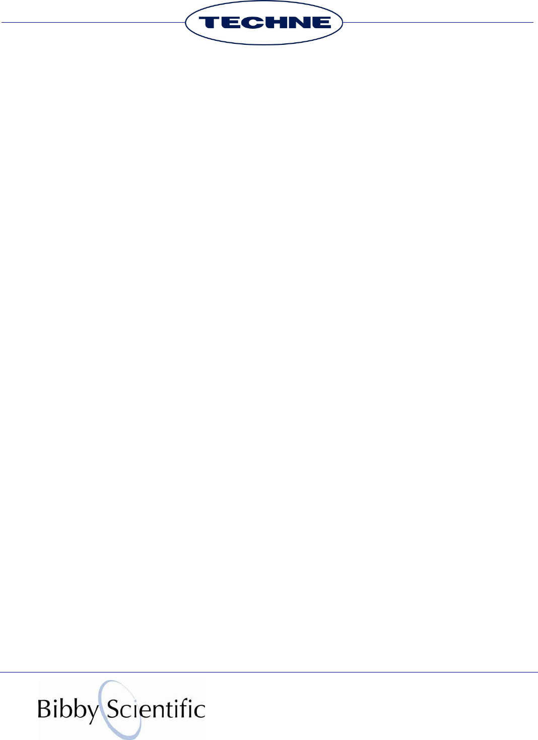 CONTACT INFORMATION For technical, sales or servicing information, contact your local Techne dealer or: UK Bibby Scientific Ltd. Beacon Road Stone Staffordshire ST15 0SA UK Tel: +44 (0)1785 812121 Fax: +44 (0)1785 810405 E-mail: sales@bibby-scientific.com www.techne.com North and South America Bibby Scientific US Inc. t/a Techne Inc. 3 Terri Lane, Suite 10 Burlington, N.J. 08016 USA Toll Free (in NA): 800-225-9243 Tel: +1 609 589 2560 Fax: +1 609 589 2571 E-mail: labproducts@techneusa.com www.techneusa.