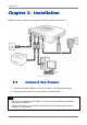 Installation Chapter 2: Installation Make sure that all devices are powered off before starting installation. Installation Diagram 2.1 Connect the Power 1. Connect the power adapter to the DC In jack of your Wireless Gateway. 2. Plug the power adapter to a wall outlet or a power strip. NOTE: • • Use only the supplied power adapter. Using other power adapters may cause damage to the device. Connect all devices to your Wireless Gateway before connecting the power adapter to a wall outlet.
