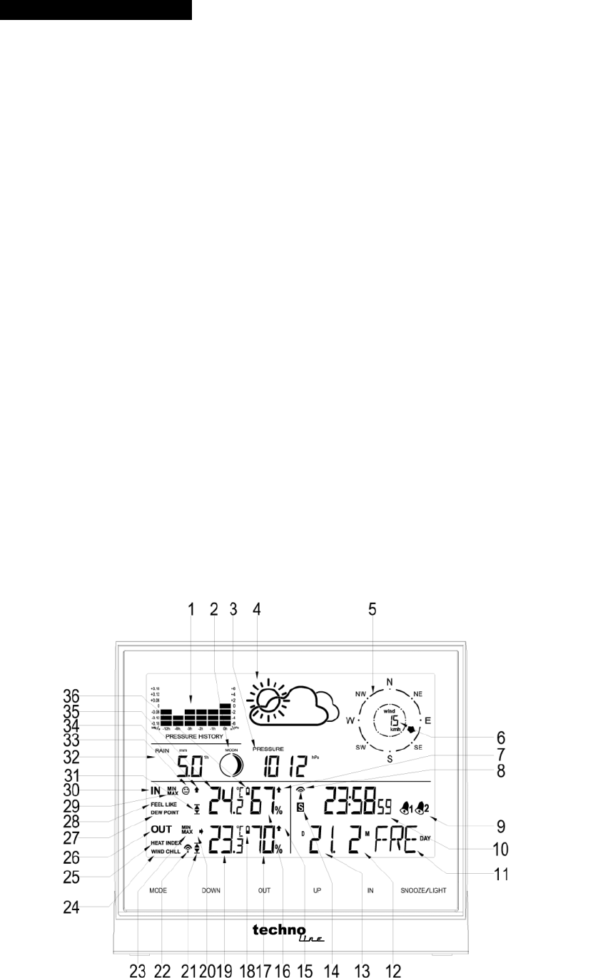 1. Barra cronologia pressione aria 12 ore 7. Tendenza umidità interna 2. Fase lunare 8. Indicatore orologio radiocontrollato 3. Pressione aria 9. Sveglia 4. Previsioni meteo 10. Ora 5. Direzione vento 11. Giorno della settimana 6. Velocità vento 12.