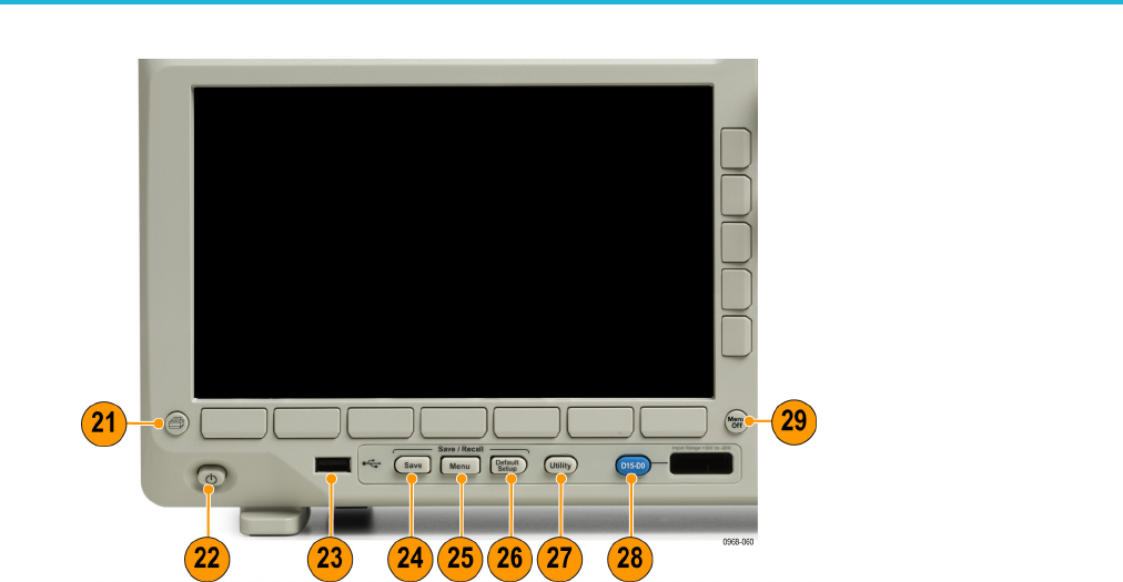 23. USB 2.0 Host port. Insert a USB peripheral to the oscilloscope, such as a keyboard or a flash drive.