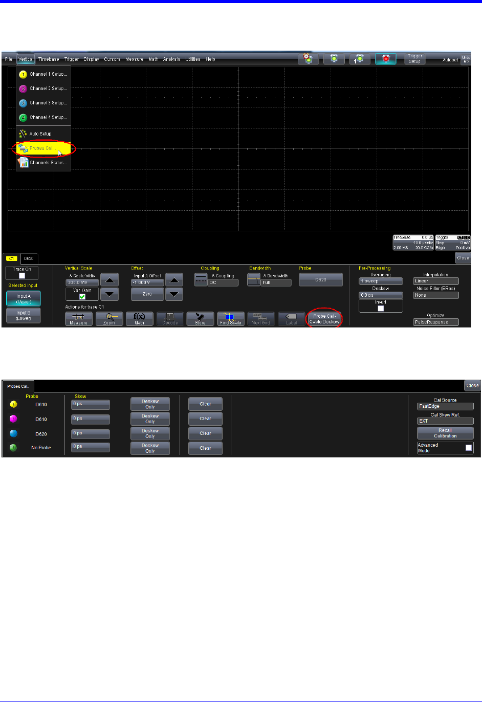 The probe calibration menu can be accessed from the Vertical drop-down menu or from the channel