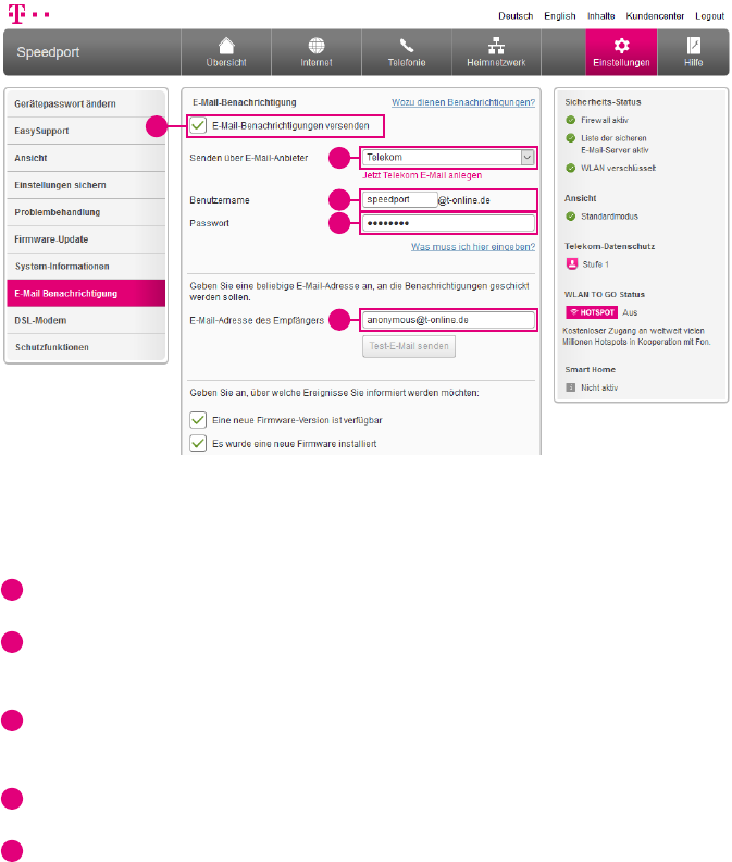 Ihr Speedport kann Sie per E-Mail über wichtige Ereignisse benachrichtigen,
