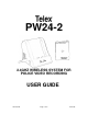 PR24 RECEIVER BASE STATION Indicators INUSE LED: CHARGE LED : Connections In Car Mic Un-terminated Cord RED BLUE BLACK YELLOW ORANGE GRAY Audio Connector Tip Ring Sleeve RF Specifications Frequency Range: Number of Channels: Diversity: Receiver Type: RF Sensitivity: FCC type acceptance: Audio Specifications Frequency Response: Audio Output Level: Distortion: Signal to Noise Ratio: Dynamic Range: General Specifications Range Power Supply: Current Draw: Size: Weight GREEN CHARGING -> RED FULL CHARGED -> GREE