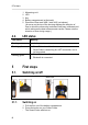 5 First steps 1 2 3 4 5 4.2. Measuring unit LED Key Battery compartment (at the back) Direction of flow testo 405i / testo 410i (not shown) (An arrow on the top of the housing displays the direction of flow in which the measuring instrument has been calibrated and which achieves the best measurement results. Please note the direction of flow during usage.) LED status LED status Meaning Flashing red Low battery status Flashing yellow • • Smart Probe is switched on.