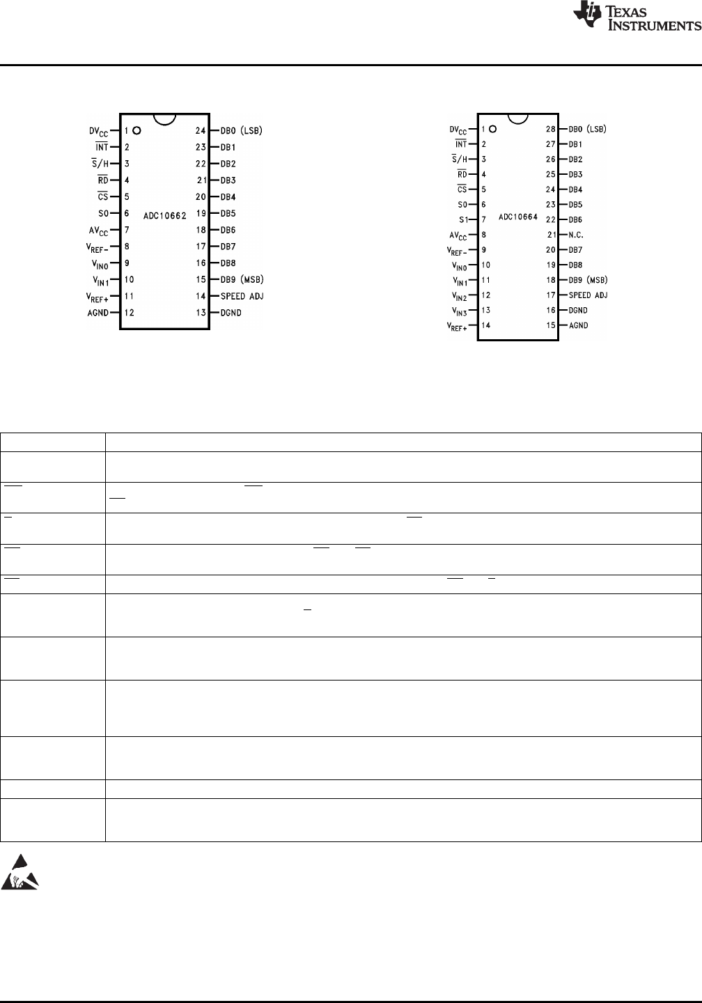 GND, AGND, Power supply ground pins. The ADC10662 and ADC10664 have separate analog and digital ground pins (AGND and