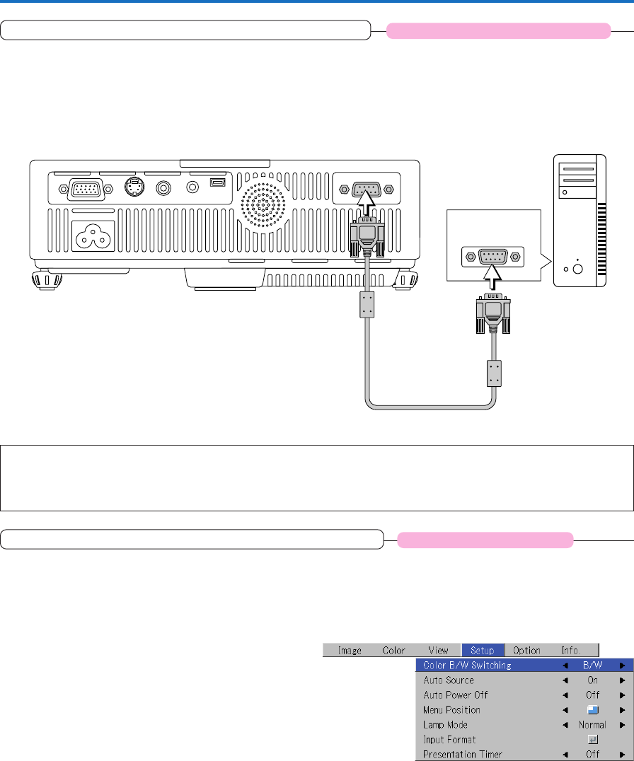 Use a commercially available serial cable (D-Sub 9-pin, straight) to connect the computer’s RS-232C connector to the projector’s