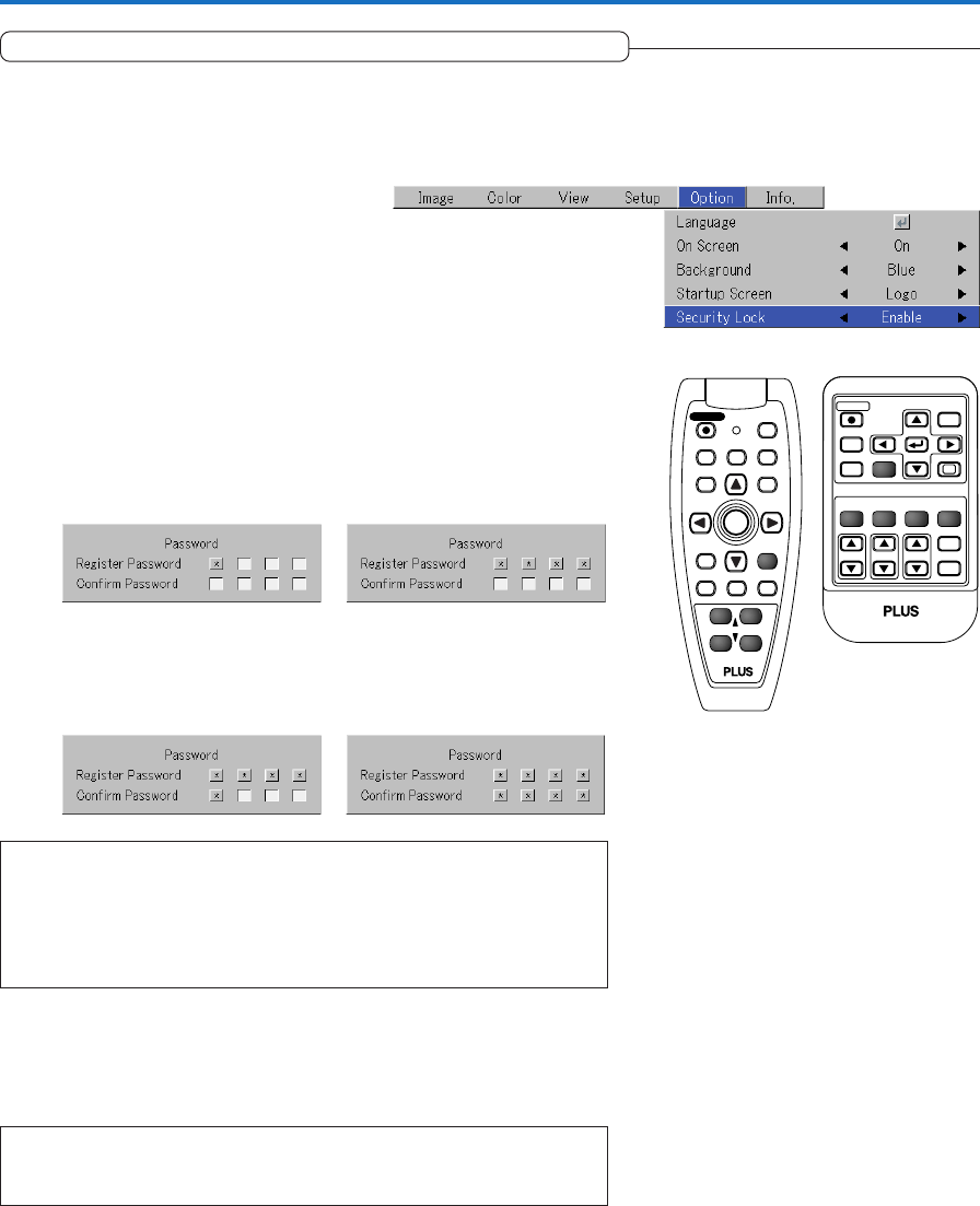 A password can be registered and the security lock set in order to protect the projector from unauthorized use.