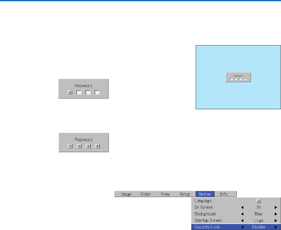 When a password has been registered, the “Password” input window appears on the projected image when the power is turned