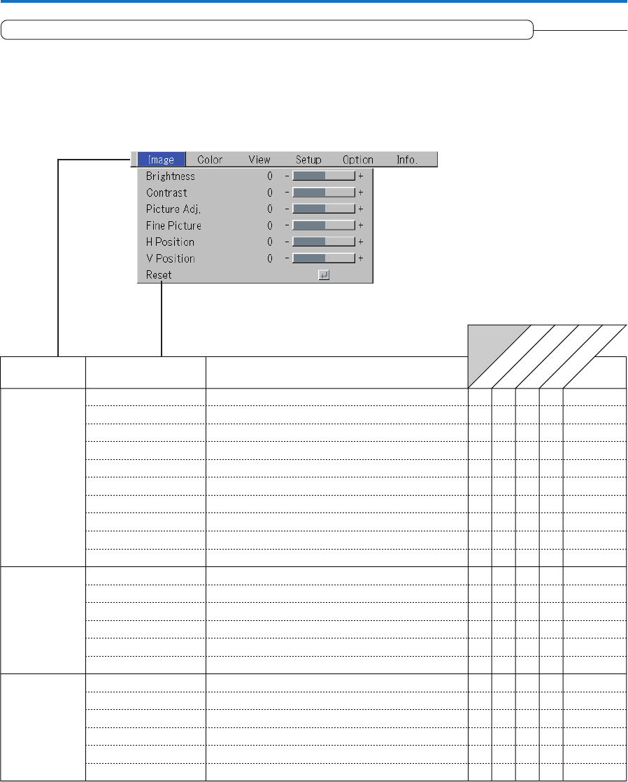 List of Item Names Offering Input Selection and Adjustments/Settings