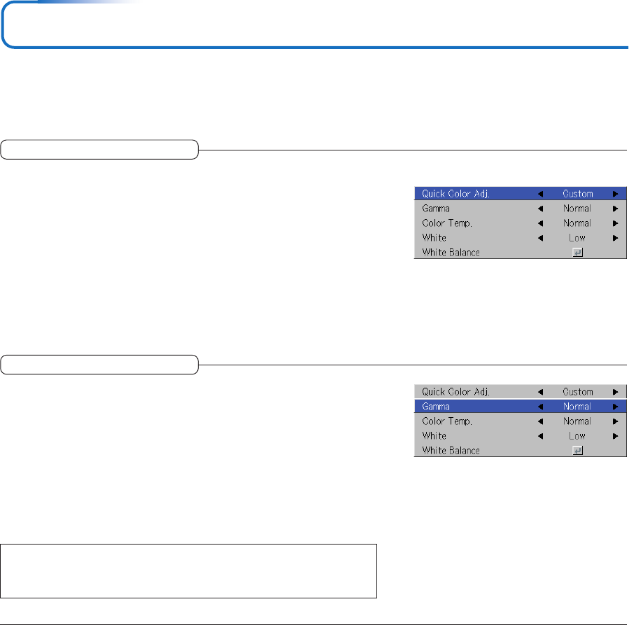 Custom ....... “Gamma”, “Color Temp.” and “White” adjustment items can be selected