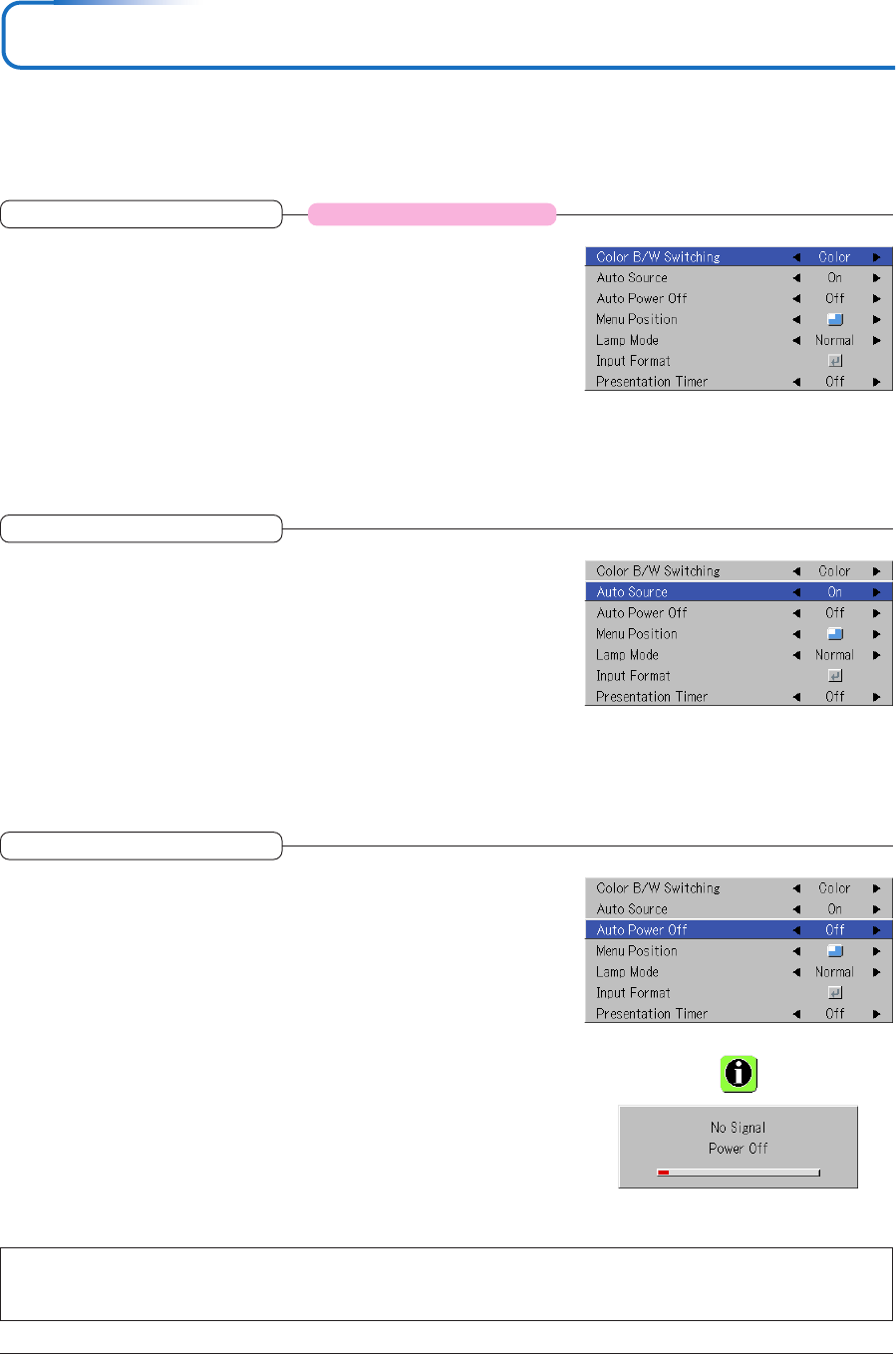 • The “No Signal Power Off” display appears when a no-signal condition con-