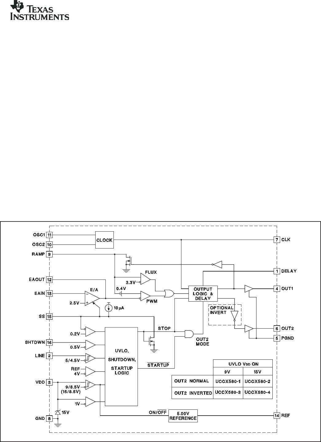 UCC1580-1,-2,-3,-4 UCC2580-1,-2,-3,-4 UCC3580-1,-2,-3,-4 DESCRIPTION (cont.) The main gate drive output (OUT1) is controlled by the pulse width modulator. The second output (OUT2) is intended to activate an auxiliary switch during the off time of the main switch, except that between each transition there is deadtime where both switches are off, programmed by a single external resistor. This design offers two options for OUT2, normal and inverted.