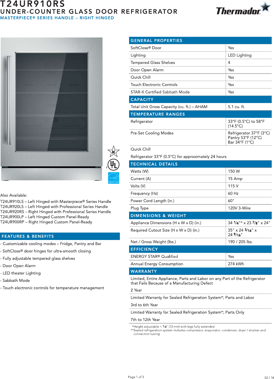T24UR910RS & UNDER-COUNTER GLASS DOOR REFRIGERATOR Thermal: MASTERPIECE® SERIES HANDLE RIGHT HINGED GLASS DOOR REFRIGERATOR PRODUCT DIMENSIONS Master 267" 2 g (686 mm) o (807 mm) S (61Dmm) “Pro 26%° & (547 mmy (677 mm) p9 237th "~ {807 {870 mm} ™. mm) {765 mm) (527 mm) 35" Nate: With the \egs fusty retracted the product has minimum dimension of 34%¢ from top 1o bottom, Yo (13mm) 47 The lags can be extended up to 2" measurements i inches {mm) GLASS DOOR REFRIGERATOR CUTOUT DIMENSIONS 237/s" Frontal view i {§
