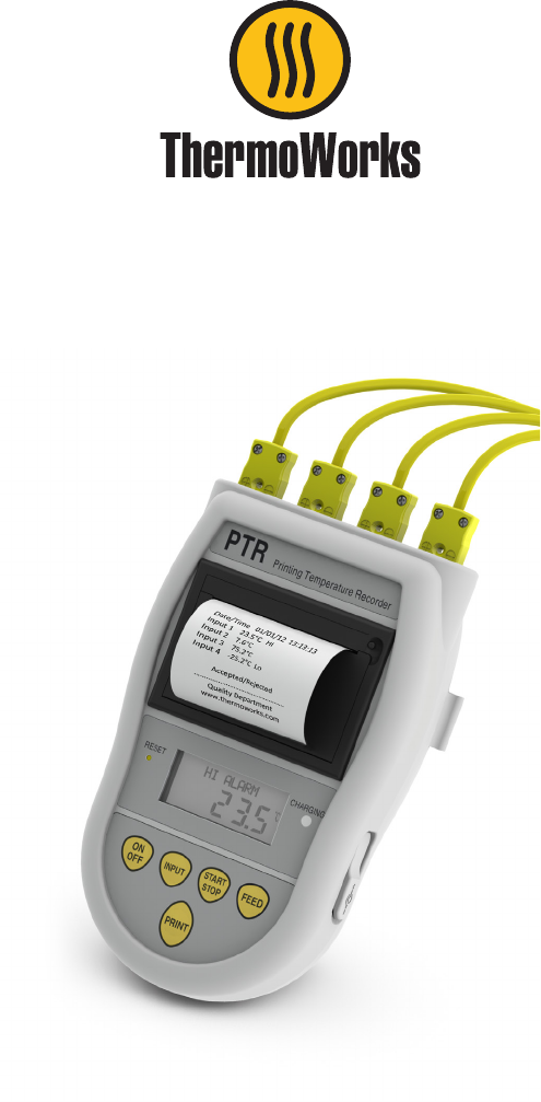 INTRODUCTION The PTR (Printing Temperature Recorder) is a hand held temperature measuring device that prints and logs temperature readings. The PTR measures temperature across the range of -328 to 2501°F (-200 to 1372°C), with a resolution 0.1°C above 1999.9°F/C. When the PTR is fully charged, up to 500 prints can be achieved. Up to 8000 readings can be stored in memory. PROBES The PTR can be used with the standard range of ThermoWorks thermocouple probes fitted with a miniature thermocouple plug.