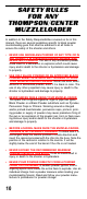 SAFETY RULES FOR ANY THOMPSON/CENTER MUZZLELOADER In addition to the Safety Responsibilities covered so far in this manual, there are several guidelines specific to black powder muzzleloading guns that must be adhered to at all times to ensure the safety of the shooter and others. • NEVER USE SMOKELESS POWDER OF ANY TYPE OR IN ANY QUANTITY IN A MUZZLELOADING FIREARM, AND NEVER MIX POWDERS.