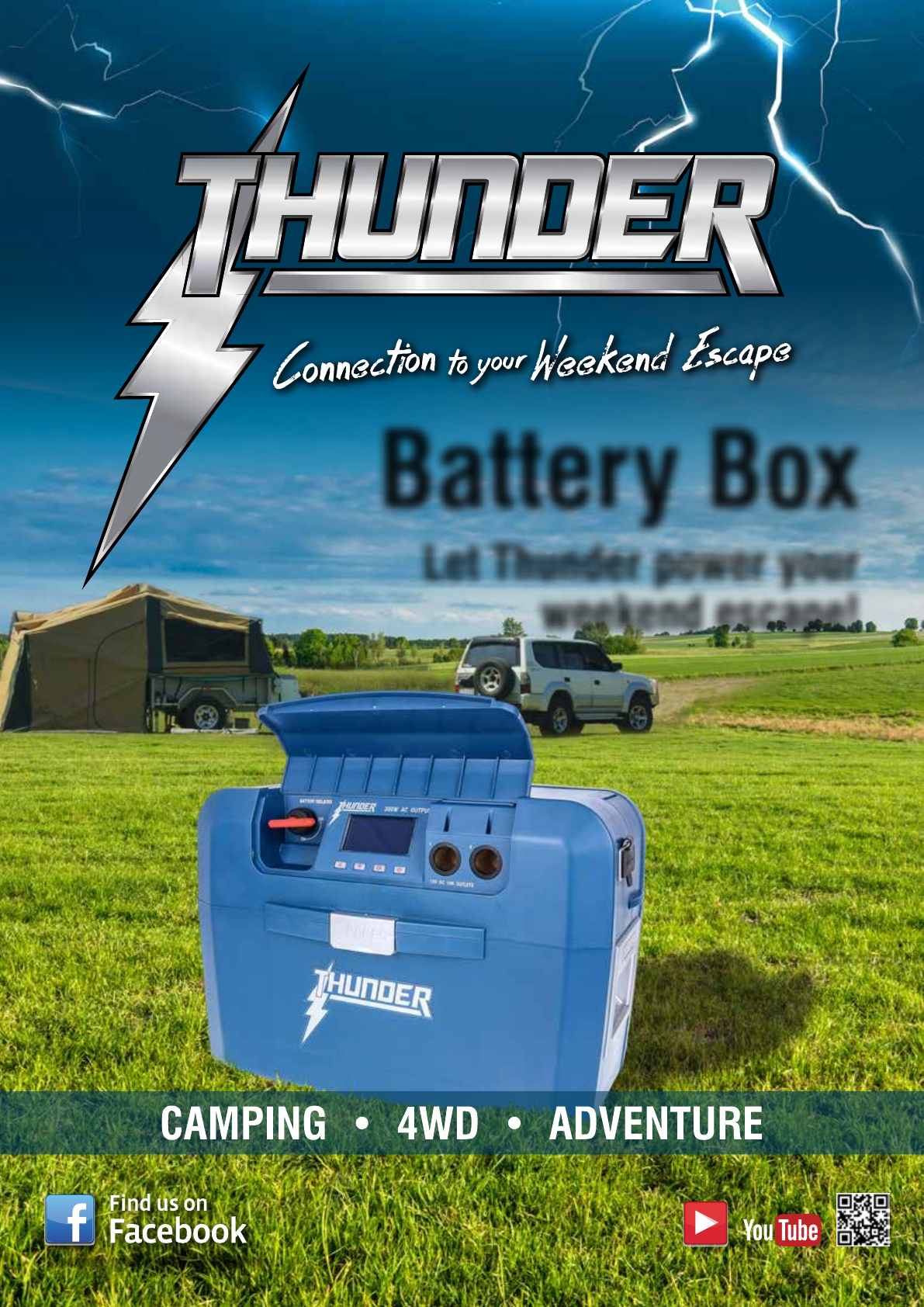 THUNDER BATTERY BOX THE THUNDER DIFFERENCE Thunder helps take you places you’ve never been before, making adventure more affordable and accessible for up and coming 4WD enthusiasts. Designed for the working adventurer, Thunder products have been tested and developed to handle anything you can throw at them without breaking the bank. The growing range of lights, switches, gauges and charging equipment is taking Australia and New Zealand by storm and is the connection to your weekend escape.