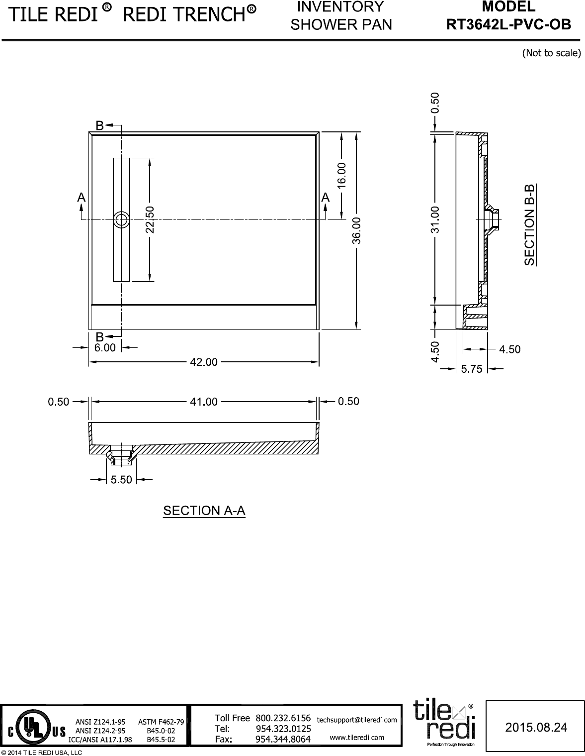 Redi Trench 42"W x 36"D Shower Pan with Left Trench