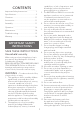 CONTENTS capabilities, or lack of experience and knowledge, unless they have been given supervision or instruction. 3. For INDOOR use ONLY. Do not use the appliance outdoors, nor in commercial or industrial environments. Do not use the appliance on wet surfaces or surfaces with standing water. 4. Do not allow to be used as a toy. Close attention is necessary when used by or near children, pets or plants. 5. Use only as described in this manual. Use only manufacturer’s recommended attachments. 6.