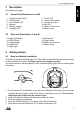 Topcom Babytalker 2000 Description ENGLISH 3 See folded cover page 3.1 1. 2. 3. 4. 5. 6. 3.2 Parent Unit (Illustration A and B) Volume indicator LED’s On/Off button Link indicator LED Speaker Desktop charger Charging LED Baby unit (Illustrations C and D) 13. Night Light button 14. On/Off button 15. Paging button 16. Power LED 17. Night Light 4 4.1 7. Power LED 8. Volume down button 9. Volume up button 10. Belt Clip 11. Battery cover screw 12. Battery cover 18. Microphone 19. Hang handle 20.