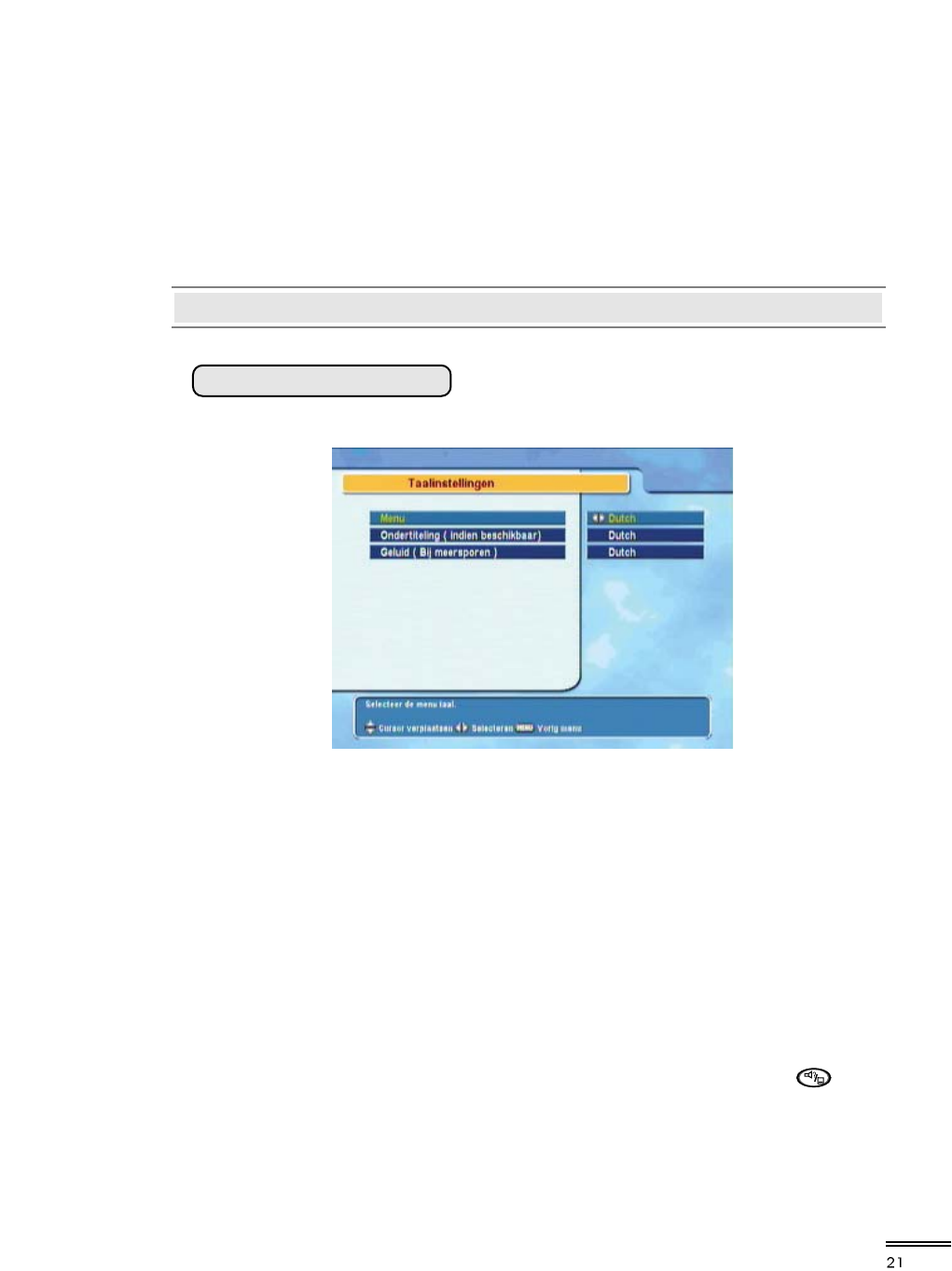Er zijn diverse talen mogelijk voor de menubediening, vooraf is Nederlands ingesteld.