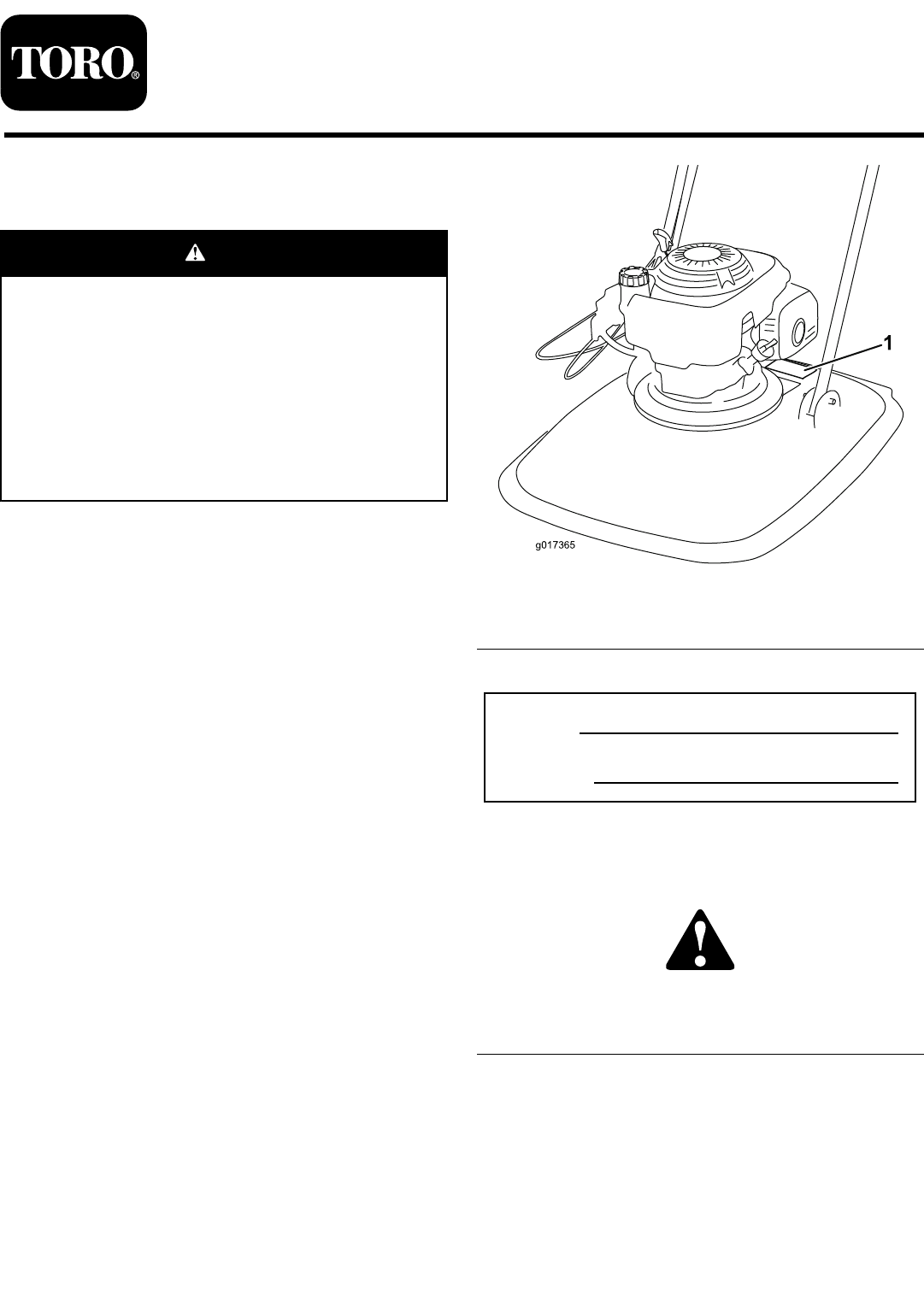 Form No. 3392-579 Rev B ホ バ ー プ ロ 550 シリ ア ル 番 号 315000001 以 上 モ デ ル 番 号 02611—シ オペレーターズマニュアル はじめに 警告 カリフォルニア州 号決 議 に よ る 警 告 第 65号 米国カリフォルニア州では、この製品に、 ガンや先天性異常などの原因となる化学物 質が含まれているとされております。 カリフォルニア州では、この製品に使用 されているエンジンの排気には発癌性や 先天性異常などの原因となる物質が含ま れているとされております。 重要 この製品のエンジンのマフラーにはスパークアレ スタが装着されておりません。カリフォルニア州の森林 地帯・潅木地帯・草地などでこの機械を使用する場合に は、法令によりスパークアレスタの装着が義務づけら れています。他の地域においても同様の規制が存在す る可能性がありますのでご注意ください。 この製品に使用されているスパーク式着火装置は、カ ナダの ICES-002 標準に適合しています。 g017365 図1 1.