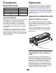 El producto Operación Especificaciones Consulte el Manual del operador de la unidad de tracción para obtener instrucciones detalladas de funcionamiento. Incline la unidad de corte cada día, ajuste la contracuchilla; consulte Ajuste de la contracuchilla contra el molinete (página 9). Pruebe la calidad de corte en una franja antes de utilizar la unidad de corte para garantizar que el acabado del corte es el correcto.