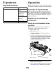El producto Operación Especificaciones Nota: Los lados derecho e izquierdo de la máquina se determinan desde la posición normal del operador. Modelo 03618 Peso neto Período de Aprendizaje Sin contrapeso: 49,4 kg Antes de utilizar los molinetes de verticorte, evalúe el rendimiento del molinete con el ajuste deseado. Utilícela en un área libre y no trabajada para observar si se consiguen los resultados deseados. Haga los ajustes necesarios. Con contrapeso pequeño (motor hidráulico): 52.