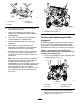 g003324 Figur 11 1. Distansbricka 3. Sidoplåtens monteringsfläns 2. Rullfäste 2. Höj klippenhetens bakre del och placera en kloss under underkniven. 3. Lossa de två muttrarna som fäster varje rullfäste och distansbricka på varje sidoplåts monteringsfläns. 4. Sänk rullen och skruvarna från sidoplåtens monteringsflänsar och distansbrickor. 5. Placera distansbrickorna på skruvarna på rullfästena. 6.