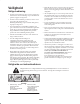 Veiligheid • Haal alle puin of andere voorwerpen weg die opgeraapt kunnen worden en door de messen van het maaidek kunnen worden weggeslingerd. Houd omstanders uit het trimgebied. Veilige bediening • Als de snijbladen op een vast voorwerp stoten of als de unit abnormaal trilt, stopt u en schakelt u de motor uit. Controleer of het maaidek niet beschadigd is. Herstel eventuele schade voordat u het maaidek weer start en gaat gebruiken.