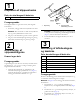 Opsætning Løsdele Brug skemaet herunder til at kontrollere, at alle dele er blevet leveret. Beskrivelse Fremgangsmåde 1 2 Antal Klippeenhed 1 Inspektion af klippeenheden. Kræver ingen dele – Afmonter vippesamlingerne. Løftekæde Kædebeslag Bøjleskrue Møtrik Skrue Spændeskive Møtrik 3 4 5 6 7 Anvendelse 5/7 5/7 5/7 10/14 5/7 5/7 5/7 Monter løftebeslagene og kæderne. Støtteben (leveres med traktionsenheden) 1 Brug af støttebenet, når klippeenheden vippes.