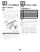 2 3 ティッパー・アセンブリを取り外す 昇降ブラケットとチェーンを取り 付ける 必要なパーツはありません。 この作業に必要なパーツ 手順 昇降アーム1番、2番、3番についている ティッパー・アセンブリは、カッティングユ ニットのキャリア・フレームと干渉しますの で、外してください。 1. ピボット・ロッドを昇降アーム2番に固定 しているロックナットとワッシャを外す (図 3)。昇降アームから、ピボット・ロッ ドとスプリングを取り外す。昇降アーム1番 および3番にも同じ作業を行う。 5/7 昇降チェーン 5/7 チェーン・ブラケット 5/7 Uボルト 10/14 ナット 5/7 ネジ 5/7 ワッシャ 5/7 ナット 手順 各昇降アームにチェーン・ブラケットを取り付 けます。各アームにUボルト1個とナット2個 を使用します。以下の手順でブラケットの位 置を調整します: 注 昇降アームの番号については 図 10 を参 照してください。 1.