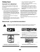 Sikkerhed • Hold omkringstående på sikker afstand af Generelt om sikkerhed • Hold børn væk fra arbejdsområdet. Lad aldrig maskinen, når den er i bevægelse. børn betjene maskinen. • Stands maskinen, sluk for motoren, aktiver Dette produkt kan forårsage personskade. Følg altid sikkerhedsforskrifterne for at undgå alvorlig personskade. parkeringsbremsen, tag nøglen ud, og vent, til alle bevægelige dele er standset, før maskinen efterses, fyldes med brændstof eller renses for tilstopninger.