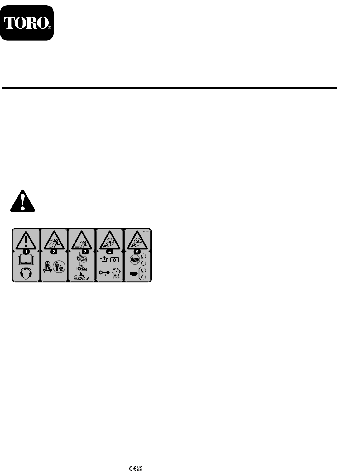 Form No. 3448-140 Rev A CE-sats Åkgräsklippare i Z Master® 4000-serien – 122 cm, 132 cm eller 152 cm Modellnr 145-1261 Modellnr 145-1262 Modellnr 145-1263 Monteringsanvisningar Obs: Om du vill skapa en uppsamlare med CE-överensstämmelse installerar du den här satsen på uppsamlarsatsen (Toro-modell 78463). Säkerhet Säkerhets- och instruktionsdekaler Säkerhetsdekalerna och anvisningarna är fullt synliga för föraren och finns nära alla potentiella farozoner. Ersätt dekaler som har skadats eller saknas.
